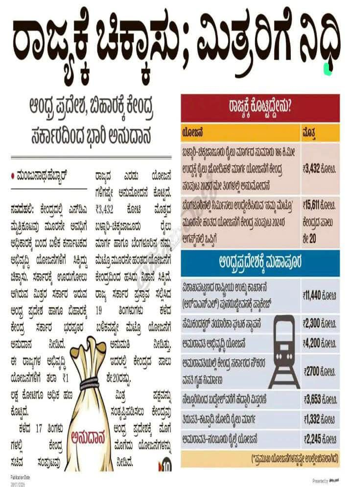 “ರಾಜ್ಯಕ್ಕೆ ಚಿಕ್ಕಾಸು; ಮಿತ್ರರಿಗೆ ನಿಧಿ” – ಈ ಸುದ್ದಿಯ ಸಾರಾಂಶ ಇಷ್ಟೇ: ಕರ್ನಾಟಕದ ಅಭಿವೃದ್ಧಿಗಿಂತ ಕೇಂದ್ರಕ್ಕೆ ತನ್ನ ‘ಕುರ್ಚಿ’ ಉಳಿಸಿಕೊಳ್ಳುವುದು ಮುಖ್ಯವಾಗಿದೆ. ಎನ್‌ಡಿಎ ಮೈತ್ರಿಕೂಟದ ಪಾಲುದಾರ ಪಕ್ಷಗಳಿರುವ ಆಂಧ್ರಪ್ರದೇಶ ಮತ್ತು ಬಿಹಾರಕ್ಕೆ ಬಂಪರ್ ಕೊಡುಗೆಗಳ ಮಹಾಪೂರವೇ ಹರಿದಿದೆ. ಆದರೆ ಅತಿ ಹೆಚ್ಚು ತೆರಿಗೆ ಕಟ್ಟುವ ಕರ್ನಾಟಕಕ್ಕೆ ಸಿಕ್ಕಿದ್ದೇನು? ಬರೀ ಚಿಕ್ಕಾಸು!